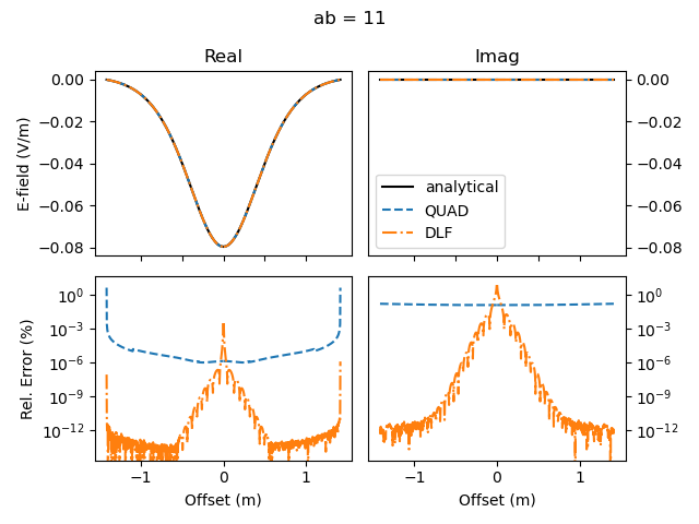ana = empymod.dipole(ab=ab, xdirect=True, **inp)